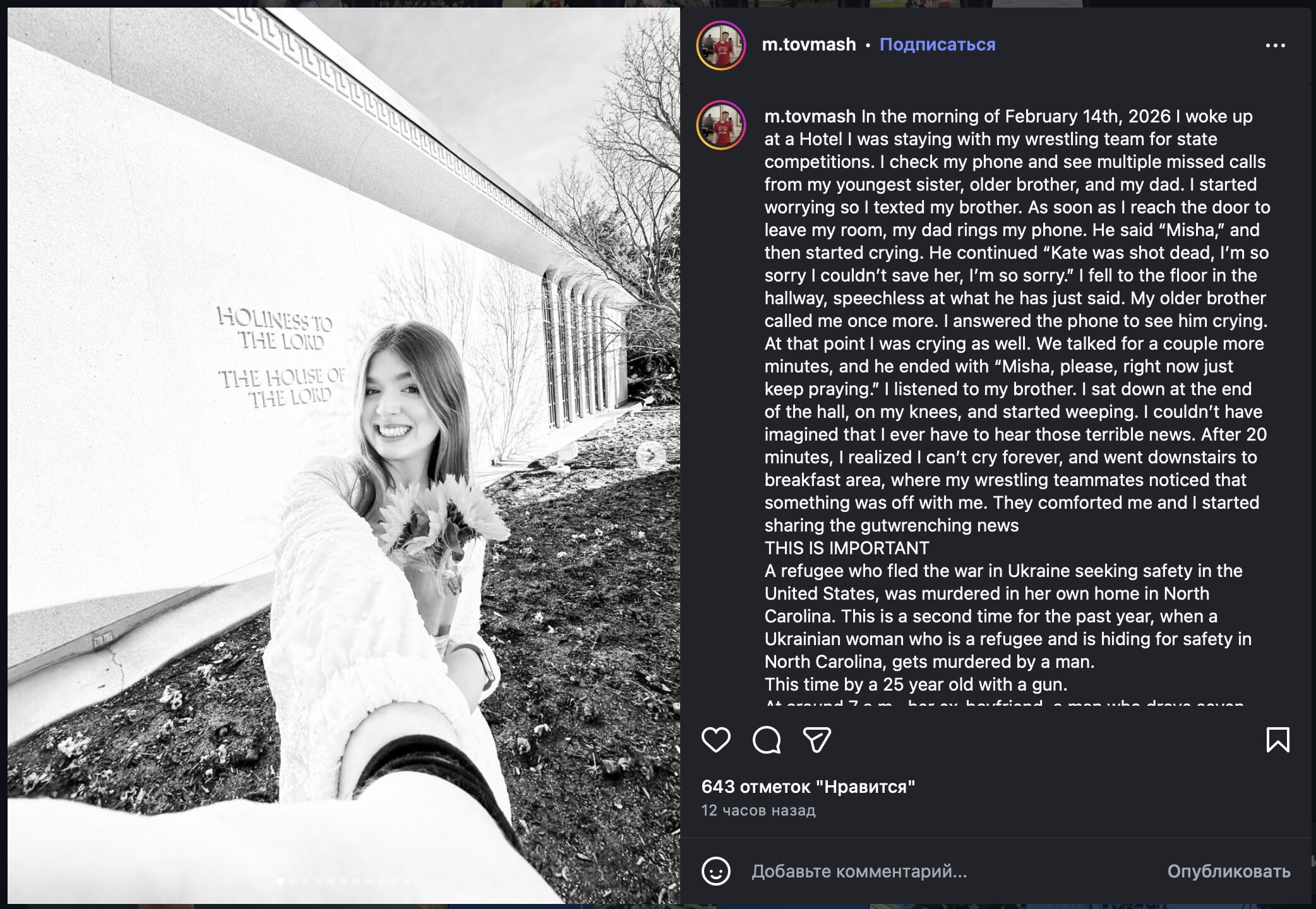«Сколько я себя помню, она всегда была рядом со мной. К счастью, она была в моей жизни с самого моего рождения. Несмотря на злость, горе и вопросы к Богу о случившемся, я благодарен, что убийца не тронул младших детей, которые находились в доме в тот момент», — написал Товмаш.