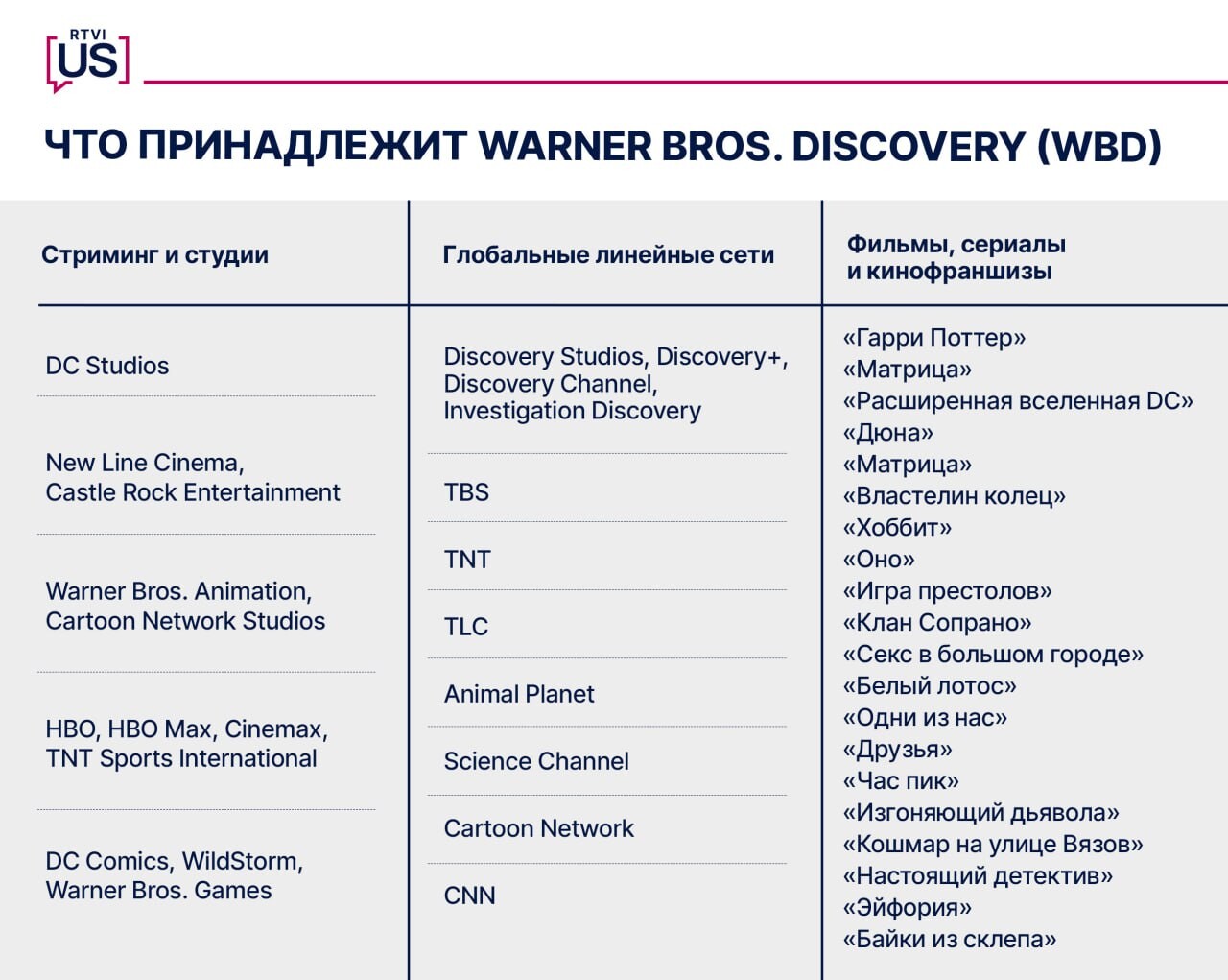 К Paramount по итогу сделки отойдут тысячи единиц интеллектуальной собственности, в том числе кинофраншизы о Гарри Поттере, Бэтмене, Супермене, а также «Дюна» и «Матрица». В состав WBD, помимо киностудии, входят кабельные каналы HBO («Игра престолов», «Клан Сопрано», «Секс в большом городе»), Discovery и новостный CNN, который придерживается околодемократической повестки.