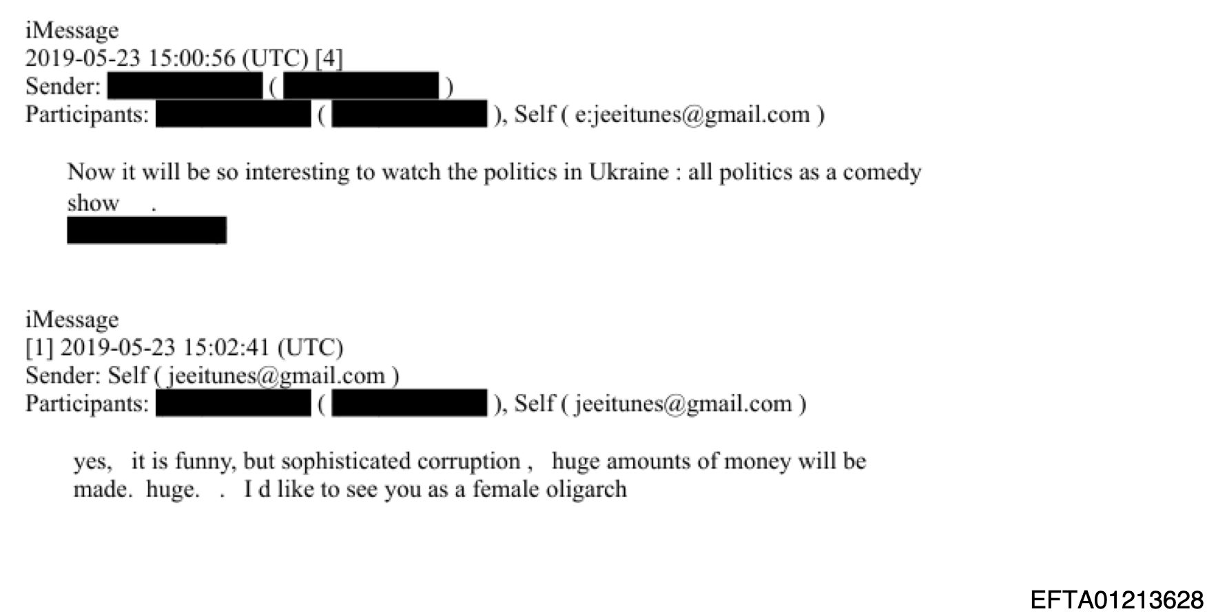 «Да, это смешно, но система коррупции очень сложная. Будут вращаться огромные суммы денег, огромные. Хотелось бы увидеть тебя женщиной-олигархом», — отвечает Эпштейн, что может говорить о том, что его засекреченный собеседник — женщина, как-то связанная с Украиной.