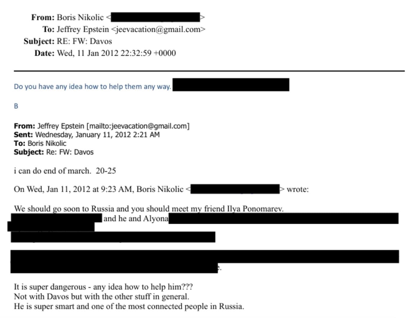 Письмо Николича Эпштейну при этом доступно в другом документе, опубликованном Минюстом США, вместе с письмом Пономарева Николичу. Депутат просил соратника Гейтса организовать ему визит на форум в Давос, чтобы там был слышен «не только официальный голос» Кремля.