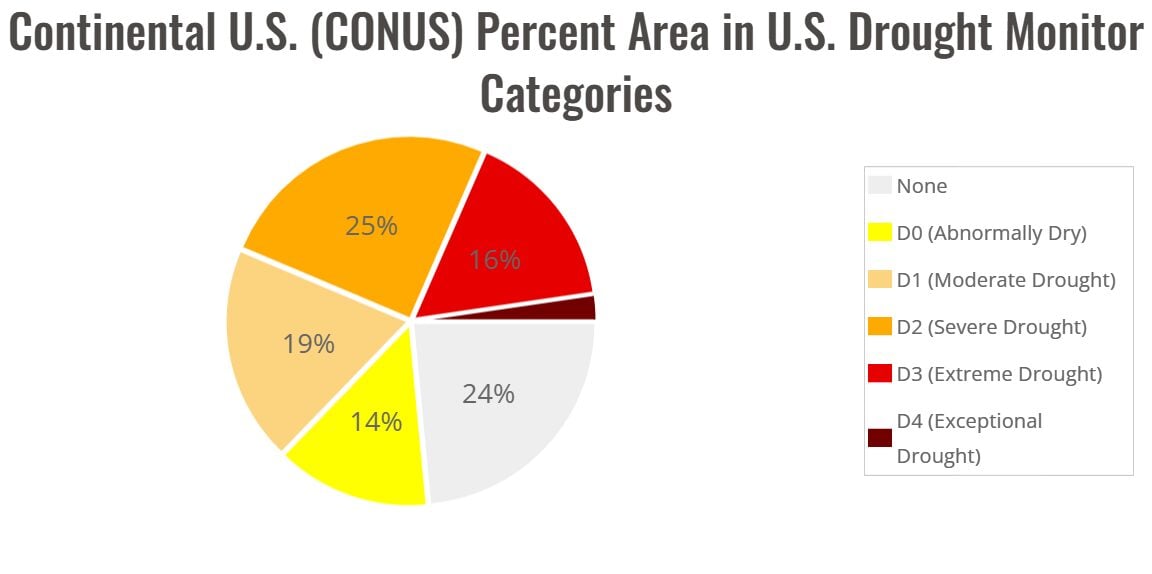 Засуха по шкале от умеренной (moderate drought) до исключительной (exceptional drought) затронула более 60% континентальной территории США — под угрозой оказался весь район юго-востока страны, около 85% юга и 70% центральных штатов, согласно данным U.S. Drought Monitor.